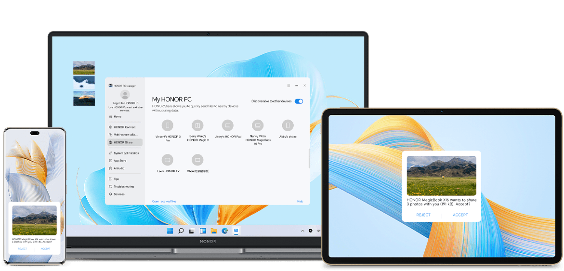 Быстрая передача изображений, видео и других файлов между ноутбуками, смартфонами и планшетами HONOR.
